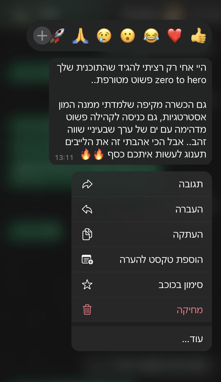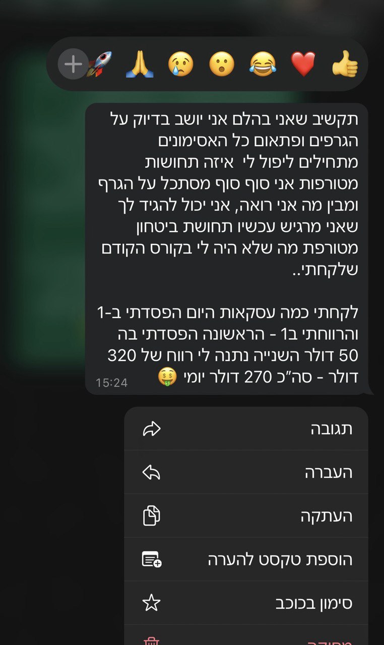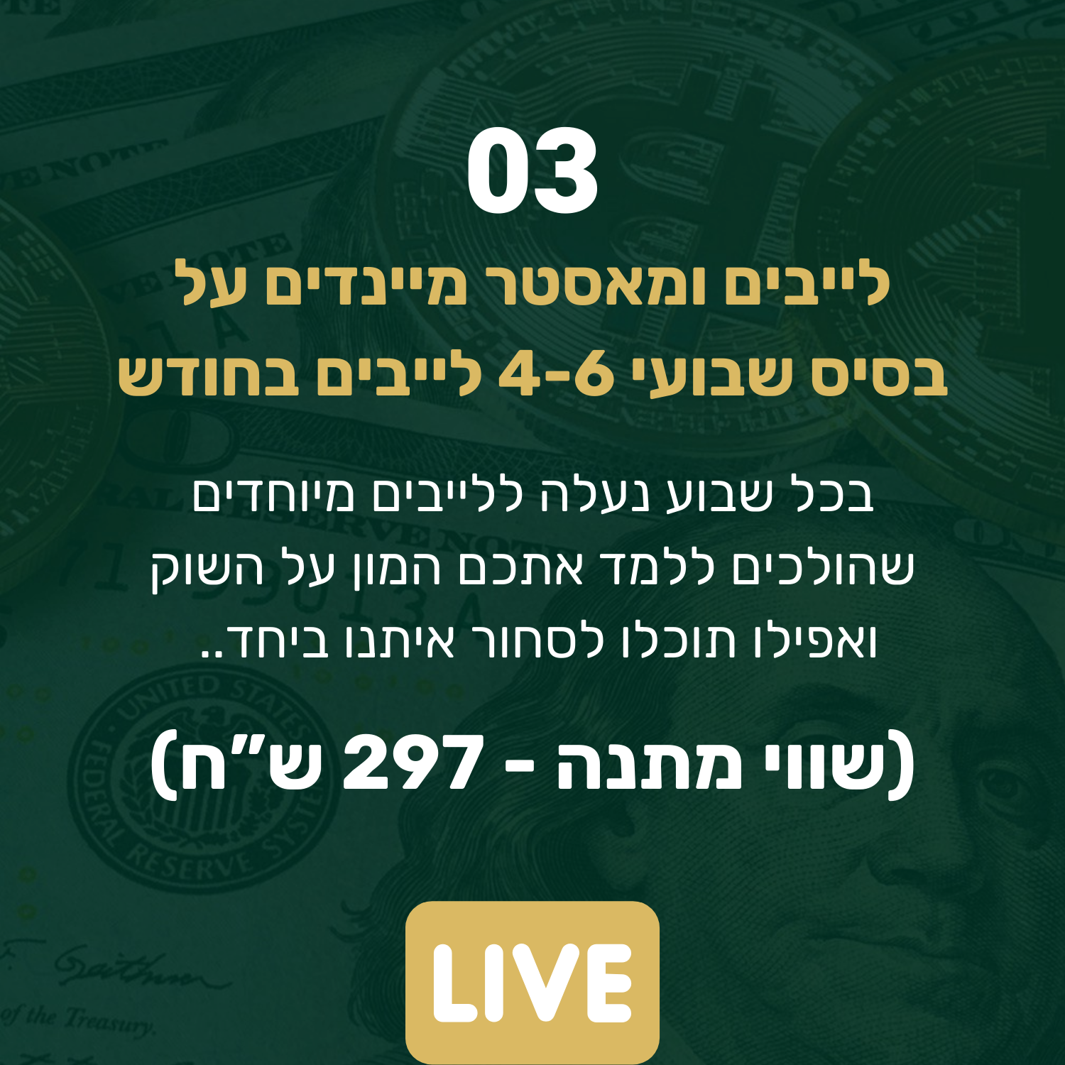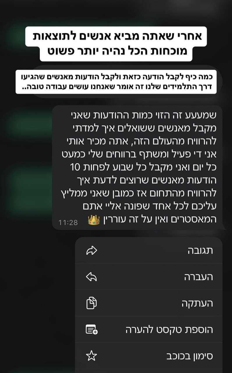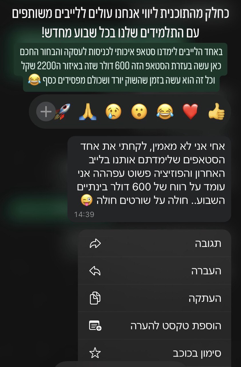 - אתה מקבל גישה ללייבי מסחר ומאסטר מיינדים על בסיס שבועי, כך שתמיד תוכל ללמוד עוד, לשפר את הידע ואפילו לעשות איתנו כסף בלייב!